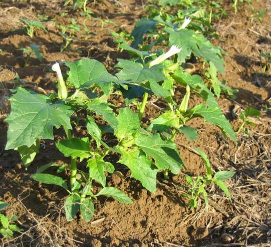 La datura stramoine est une plante annuelle qui a les fleurs en forme de trompette de 10/15cm de longueur et de couleur blanche. Le datura officinal, stramoine ou stramoine commune (datura stramonium l.) est une espèce de plantes dicotylédones de la famille des solanaceae. 3.3.311 datura stramoine plantule (wikipedia) datura dans du maïs (m.
